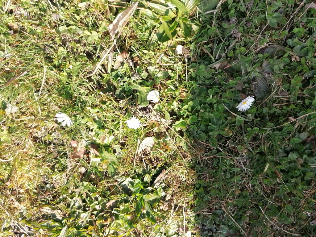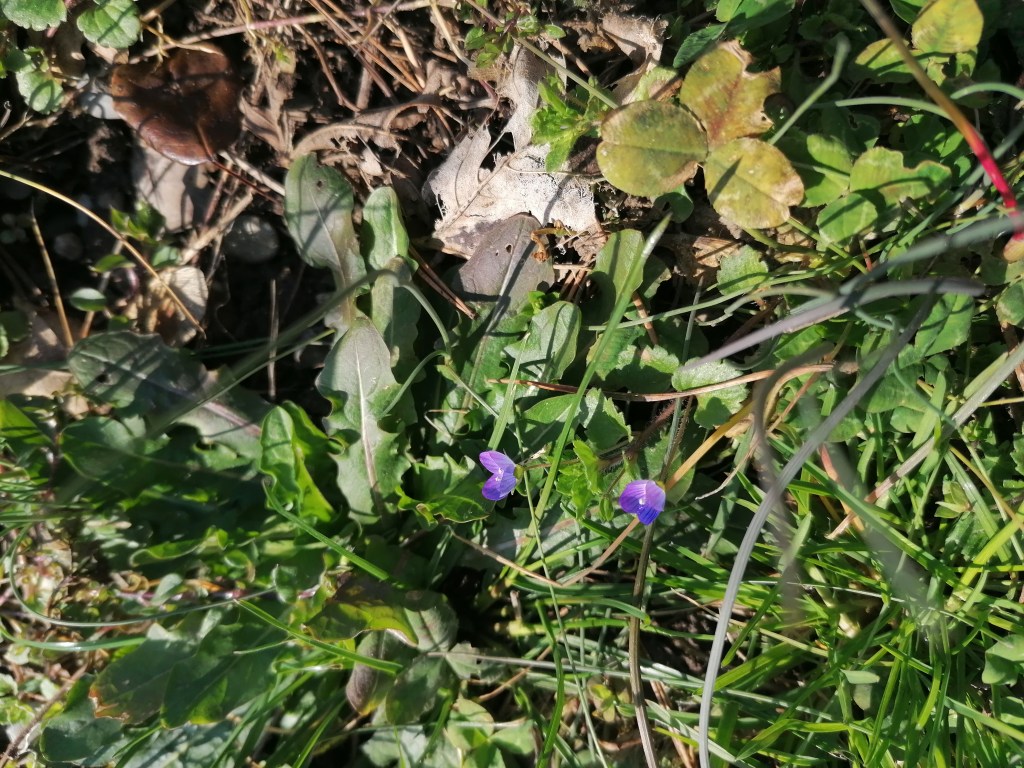 Nous avons vu de la dent de lion, des pâquerettes, des violettes, des bourgeons, un cerisier en fleur, du plantain et des futures jonquilles.