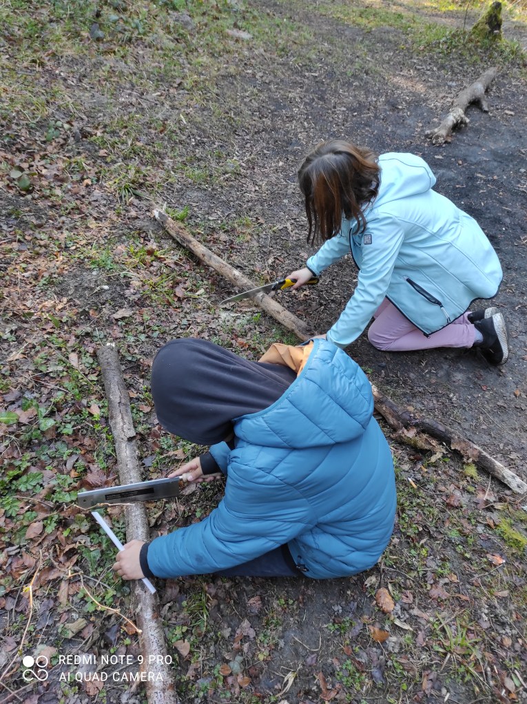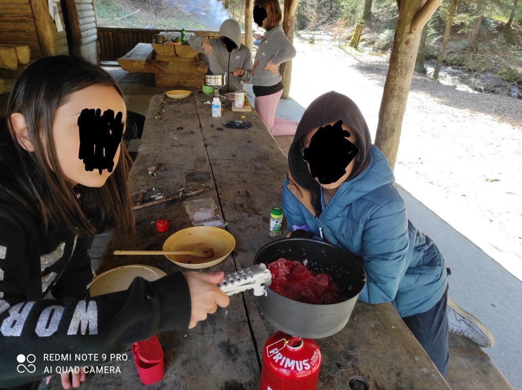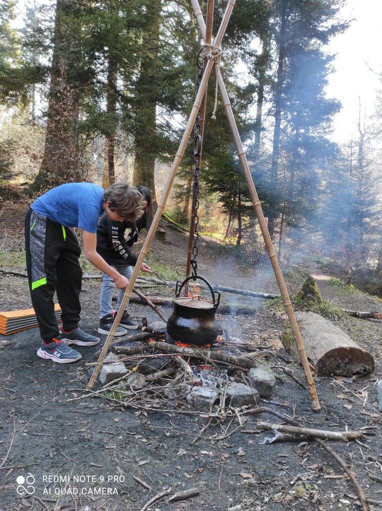 avons fait cuire les pâtes dans un chaudron et on a grillé des cervelas sur le feu.