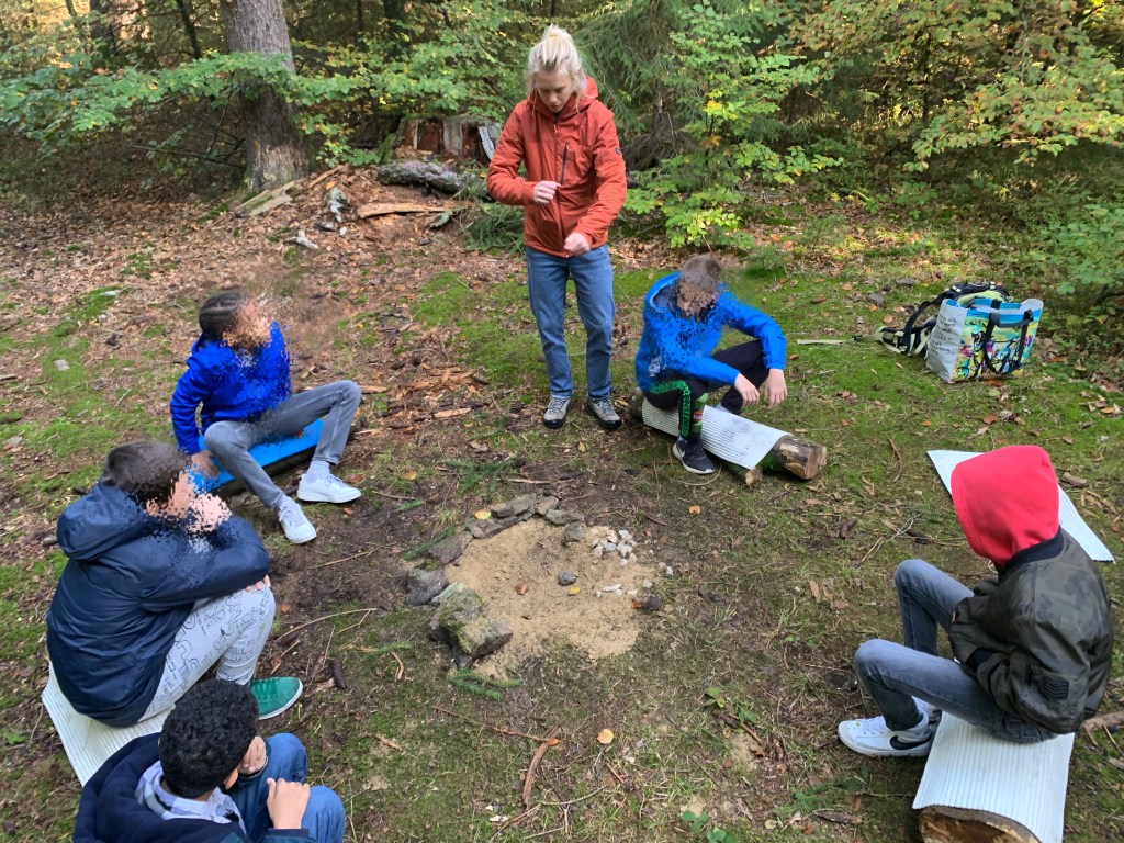 Le coin forêt est joli. Il se trouve dans bois du Jorat. Il y a beaucoup d’épicéas et des hêtres. Nous allons renaturaliser la forêt en ramassant les déchets et en nettoyant les foyers sauvages. Nous sommes en train de construire le nôtre, en déplaçant la mousse ailleurs et en mettant du sable dans le fond pour protéger le sol et la terre.