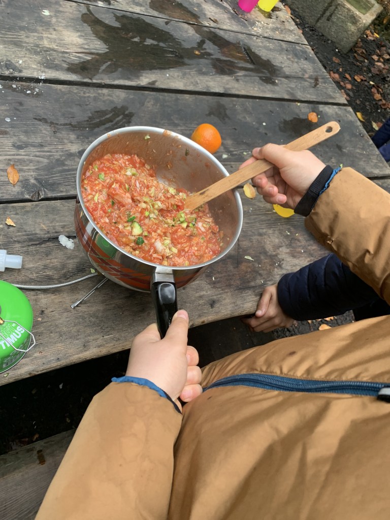 On a fait de la cuisine en forêt. Nous avons mangé des chips aux orties. Nous avons créé une sauce aux lardons, crème, fromage, tomates, gingembre et poivron.